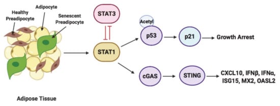 Contrarily to STAT1, STAT3 deletion was associated with increased STING expression in proliferating preadipocytes accompanied by an increase in the expression of IFNα, IFNβ, CXCL10 and IL6. Consistent with our observations, emerging studies in different cell types reported that STAT3 deficiency contributed to enhanced antiviral responses and to increases in the expression of CXCL10 [67,68,69]. On the other hand, the link between STAT3 and IL6 has been reported in inflammation and cancer studies [70,71]. Therefore, understanding the molecular mechanisms associated with the functional interplay between STAT1 and STAT3 activation could provide a promising tool to control SASP secretion in senescent preadipocytes.