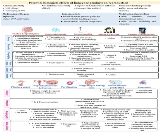 Owing to the diversity of chemical constituents in honeybee products, a wide range of biological effects on reproductive functions could be achieved via several biological mechanisms/pathways. For example, most honeybee products contain phenolic compounds, widely known to affect reproduction in mammals. Phenolic compounds can regulate gonadal steroidogenesis and the functionality and metabolism of sex steroid hormones [,]. In addition, phenolic compounds can affect the expression of genes and activity of enzymes (aromatase, topoisomerases I and II, and extracellular signal-regulated kinases) involved in the regulation of reproductive events. Phenolic compounds can also contribute to cellular apoptotic/proliferation, epigenetic, antioxidant, and inflammatory pathways []. Metabolic status may also be affected by phenols owing to their ability to regulate metabolic hormone signals such as growth hormone, insulin-like growth factors, and triiodothyronine, as well as lipid, protein, and carbohydrate metabolism. Furthermore, sex hormones have been detected in some bee products, such as royal jelly and drone brood, which can thus modulate endocrine system functions []. Drone brood is rich in male sex hormones, especially testosterone, producing an androgenic effect that enhances male sex features. Drone brood can also be classified as a natural anabolic agent that can increase body muscle weight in male individuals [,]. Additionally, nutrients, vitamins, and minerals can directly affect reproductive tissues, reinforcing their functions and improving gametogenesis and/or the quality of gametes []. Therefore, honeybee products can provide effective tools for improving reproductive functions in vivo and assisted reproductive technique (ART) outputs in vitro. The potential effects of honeybee products on mammalian reproductive functions and ARTs are shown in Figure 1.