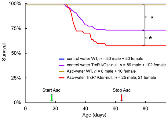 3.1. Ascorbate Supplementation Exacerbates Acute Liver Failure Frequencies in Mice with TrxR1/Gsr-Null Livers