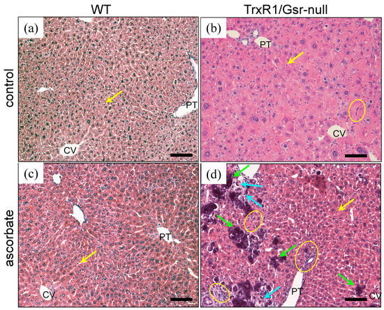 3.2. Ascorbate Causes Severe Pathology in TrxR1/Gsr-Null Livers