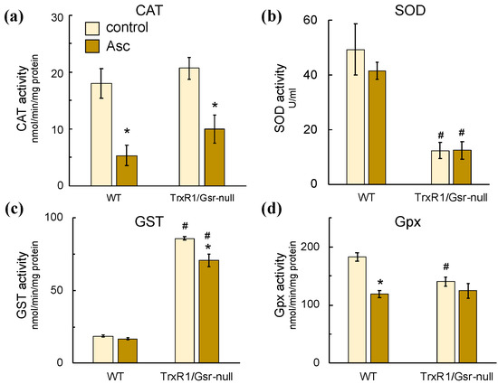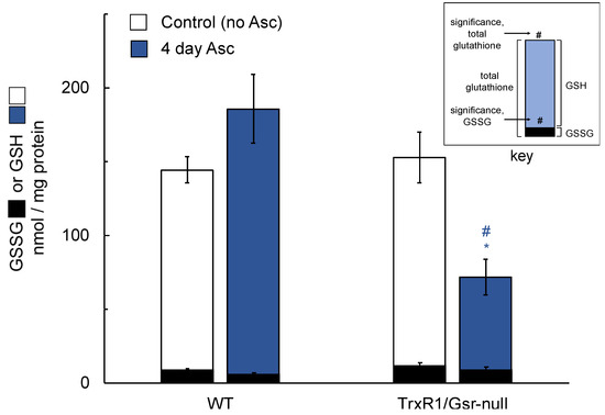 3.3. Ascorbate Treatment Depletes Glutathione in TrxR1/Gsr-Null but Not in WT Livers