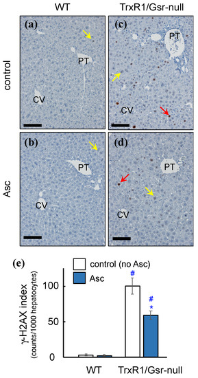 3.5. Ascorbate Treatment Lowers the Incidence of DNA Damage in TrxR1/Gsr-Null Livers