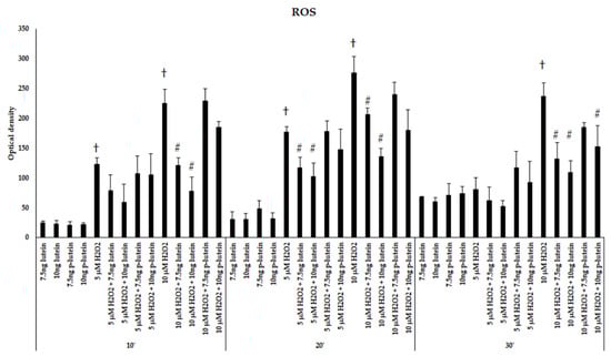 Reactive oxygen species detection after lutein and H2O2 treatment in BV-2 cells. The columns represent the mean values and error bars indicate the standard deviation (SD) of three independent experiments (n = 3), each performed in quadruplicate, and are presented relative to own control cells. † indicates statistical significance of H2O2 treated cells compared to controls, # marks statistical significance of combined (lutein with H2O2) treatments compared to H2O2 treatments; the level of significance was p < 0.05. Abbreviations: p-lutein is 24 h of lutein pre-treatment, 10′–10 min, 20′–20 min, 30′–30 min.