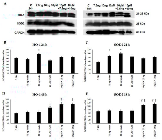 (A) Western blot analyses of antioxidant proteins HO-1 and SOD2 in lutein and in H2O2-treated BV-2 cells at 24 and 48 h. GAPDH was used as loading control. (B–E) Optical density analyses of HO-1 and SOD2 in BV-2 cells at 24 and 48 h. The columns represent mean values and error bars represent standard deviation (SD) of three independent determinations (n = 3). * indicates statistical significance of lutein treatments versus controls; † indicates statistical significance of H2O2 -treated cells compared to controls; # indicates statistical significance of combined (lutein with H2O2) treatments compared to H2O2 treatments; the level of significance was p < 0.05. Abbreviations: C marks the appropriate absolute controls at 24 and 48 h; 7.5 ng means 7.5 ng/µL of lutein; 10 ng means 10 ng/µL of lutein; 10 µM refers to 10 µM H2O2.