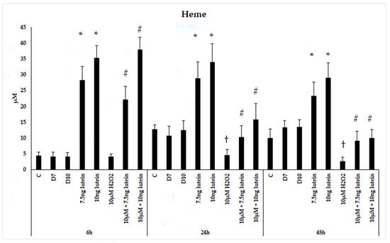 Determinations of heme concentration in lutein and H2O2-treated BV-2 cells. The columns represent the mean values and error bars indicate the standard deviation (SD) of four independent experiments (n = 4), each performed in triplicate, and are presented relative to own control cells. * indicates statistical significance of lutein treatments versus controls; † indicates statistical significance of H2O2-treated cells compared to controls; # indicates statistical significance of combined (lutein with H2O2) treatments compared to H2O2 treatments; the level of significance was p < 0.05. Abbreviations: C marks the appropriate absolute controls at 6, 24 and 48 h; D7 means the same amount of DMSO as 7.5 ng/µL of lutein was added; D10 means the same amount of DMSO as 10 ng/µL of lutein was used in the treatments.