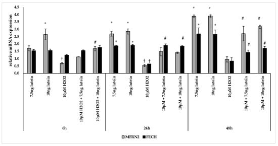 Effects of lutein and H2O2 treatment on mRNA expressions of MFRN2 and FECH. The columns represent the mean values, and error bars indicate the standard deviation (SD) of three independent experiments (n = 3), each performed in triplicate, and are presented relative to own control cells. * indicates statistical significance of lutein treatments versus controls; † indicates statistical significance of H2O2-treated cells compared to controls; # indicates statistical significance of combined (lutein with H2O2) treatments compared to H2O2 treatments; the level of significance was p < 0.05. Real-time PCR was performed with the SYBR green protocol using gene-specific primers. β-actin was used as house-keeping gene for the normalization. The relative expression of controls was regarded as 1.