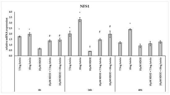 Furthermore, we investigated the NFS1 mRNA expression, which participates in Fe-S cluster assembly providing sulfur from cysteine. The 7.5 and 10 ng/µL of lutein treatments increased the NFS1 expression at a significantly higher level at 6 and 24 h, and also in the case of 10 ng/µL of lutein at 48 h compared to the appropriate controls (Figure 9). Treatment with 10 µM H2O2 decreased the expression of NFS1 at 24 h, while it showed no alterations at 6 and 48 h. In the combined treatment a significant increase was observed at 6 and 24 h compared to H2O2 treatments (Figure 9).