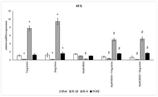 Effects of lutein and H2O2 on Iba1, IL-1β, IL-4 and TGFβ mRNA expression at 48 h. The columns represent the mean values, and error bars indicate the standard deviation (SD) of three independent experiments (n = 3), each performed in triplicate, and are presented relative to own control cells. * indicates statistical significance of lutein treatments versus controls; † indicates statistical significance of H2O2-treated cells compared to controls; # indicates statistical significance of combined (lutein with H2O2) treatments compared to H2O2 treatments; the level of significance was p < 0.05. Real-time PCR was performed with the SYBR green protocol using gene-specific primers. β-actin was used as house-keeping gene for the normalization. The relative expression of controls was regarded as 1.