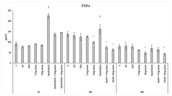TNFα secretion in lutein and in H2O2-treated BV-2 cells. The columns represent the mean values, and error bars indicate the standard deviation (SD) of three independent experiments (n = 3), each performed in triplicate, and are presented relative to own control cells. * indicates statistical significance of lutein treatments versus controls; † indicates statistical significance of H2O2-treated cells compared to controls; the level of significance was p < 0.05. Abbreviations: C marks the appropriate absolute controls at 6, 24 and 48 h; D7 means the same amount of DMSO as 7.5 ng/µL of lutein was added; D10 means the same amount of DMSO as 10 ng/µL of lutein was used in the treatments.