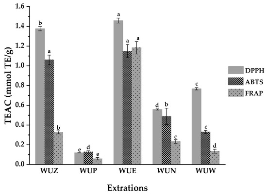 Trolox equivalent antioxidant capacity (TEAC) of different fractions from WUE tested by DPPH, ABTS, and FRAP assays. Means labeled by different letters (a–h) were significantly different at a level of p < 0.05 (n = 3) by DMRT (Duncan’s multiple range test).