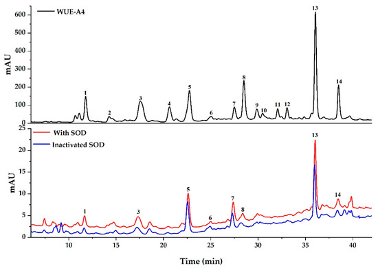 The UF-HPLC-UV chromatograms of WUE-A4 with superoxide dismutase. The black, red, and blue lines represent the HPLC-UV profiles of WUE-A4 without ultrafiltration, with activated and inactivated superoxide dismutase, respectively.