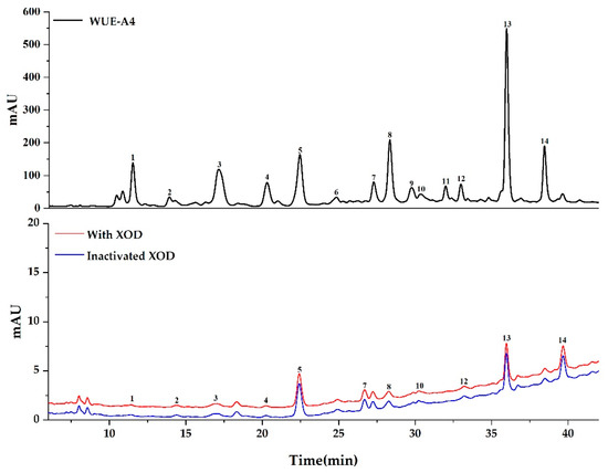 The UF-HPLC-UV chromatograms of WUE-A4 with xanthine oxidase. The black, red, and blue lines represent the HPLC-UV profiles of WUE-A4 without ultrafiltration, with activated xanthine oxidase, and with inactivated xanthine oxidase, respectively.