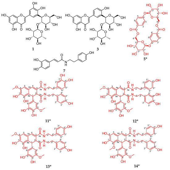Nine and 12 components in WUE-A4 showed distinctive binding affinities to SOD and XOD after the affinity ultrafiltration screening, respectively, as shown in Figure 3, Figure 4, and Table 3. These potential ligands were identified and characterized by HPLC-UV/ESI-MS/MS analysis. The mass spectrum data, such as Rt, m/z, and representative MS/MS fragments in the negative mode, were listed in Table 3. Theoretically, bioactive components in WUE-A4 could be tentatively identified by characteristic MS/MS fragments as compared to known databases or standards. However, for some unknown or new compounds, the isolation of pure compounds and subsequent structure elucidation should also be done. In this context, eight compounds were isolated from WUE-A4 by using modern separation and purification techniques, including CC, TLC, and HPLC, and then their structures were accurately identified by NMR and UPLC-QTOF-MS/MS (detail compounds data were recorded in Supplementary Materials). Isolation of WUE-A4 resulted in the identification of eight compounds (Figure 5), including four new lignanamides: 1-(3,4-dihydroxy-5-methoxyphenyl)-1,2-dihydroxy-7,8-dihydroxy-N-[(3,4-dihydroxyphenyl)-ethyl]-N′-[(4-hydroxyphenyl)-ethyl]-6-methoxynaphthalene-2,3-dicarboxamide (11), 1-(3,4-dihydroxy-5-methoxyphenyl)-1,2-dihydroxy-7,8-dihydroxy-N-[(4-hydroxyphenyl)-ethyl]-N′-[(4-hydroxyphenyl) -ethyl]-6-methoxynaphthalene-2,3-dicarboxamide (12), 1-(3,4-dihydroxy-5-methoxyphenyl)-1,2-dihydroxy-7,8-dihydroxy-N,N′-bis-[2-(4-hydroxyphenyl)ethyl]-6-methoxynaphthalene-2,3-dicarboxamide (13), and 1-(3,4-dihydroxy-5-methoxyphenyl)-1,2-dihydroxy-6,7-dihydroxy-N,N′-bis-[2-(4-hydroxyphenyl)-ethyl]-8-methoxynaphthalene-2,3-dicarboxamide (14) [34], one new macrocyclic glycoside: 4-[(6′-O-β-D-allopyranosyl)-oxy]-hydroxy-benzoic acid cyclic dimeric inner ester (5) [35], one known phenolic amide: N-trans-caffeoyltyramine (7) [36], and two known C-glycosyl flavonoids: 2-[3-[2-O-(6-deoxy-α-L-mannopyranosyl)-β-D-glucopyranosyl]-4,5-dihydroxyphenyl]-5,7-dihydroxy-4H-1-benzopyran-4-one (1) and 2-[3-[2-O-(6-deoxy-α-L-mannopyranosyl)-β-D-glucopyranosyl]-4-hydroxyphenyl]-5,7-dihydroxy-4H-1-benzopyran-4-one (3) [37]. In addition, the detailed structural elucidation of five new compounds, including Compound 5 and Compounds 11–14, was stated as below.