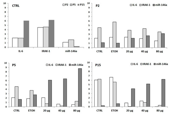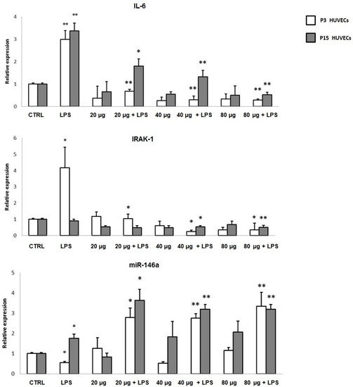- Olivieri, F.; Lazzarini, R.; Recchioni, R.; Marcheselli, F.; Rippo, M.R.; Di Nuzzo, S.; Albertini, M.C.; Graciotti, L.; Babini, L.; Mariotti, S.; et al. MiR-146a as marker of senescence-associated pro-inflammatory status in cells involved in vascular remodelling. Age (Omaha) 2013, 35, 1157–1172. [Google Scholar] [CrossRef] [PubMed]