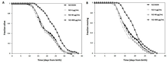 - Wilson, M.A.; Shukitt-Hale, B.; Kalt, W.; Ingram, D.K.; Joseph, J.A.; Wolkow, C.A. Blueberry polyphenols increase lifespan and thermotolerance in Caenorhabditis elegans. Aging Cell 2006, 5, 59–68. [Google Scholar] [CrossRef]