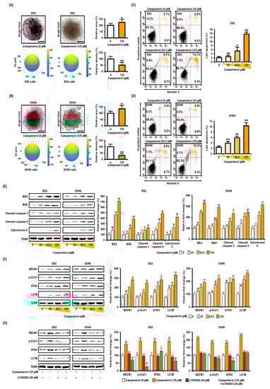 We tested the effects of campesterol on a 3D ovarian cancer model. The hanging ovarian cancer cells (3 × 103 cells/drop) were treated with the vehicle or campesterol (125 µM). The aggregated cancer cell area was estimated using ImageJ software. The 3D structure was calculated using the ReViSP software. Campesterol suppressed the aggregation of human ovarian cancer cells. The area of the aggregated ovarian cancer cells was increased to 123% and 135%, respectively, for each cell line ES2 and OV90 compared to that in the vehicle-treated controls (100%). However, the density of the ovarian cancer cells was reduced to 50% and 30%, respectively, for both the cell lines compared to that in the vehicle-treated group (100%) (Figure 1A,B). These data show that the aggregation of the ovarian cancer cells was suppressed by campesterol treatment. Next, we investigated the apoptosis induced by campesterol (0, 25, 62.5, and 125 µM) in the ovarian cancer cells using annexin V and propidium iodide (PI) staining (upper right quadrant in Figure 1C,D). In the ES2 cells, the percentage of cells in the late apoptosis phase was increased to 2.6%, 5.4%, and 13.7% upon treatment with 25, 62.5, and 125 µM of campesterol, respectively, compared with that in the vehicle-treated control (2.1%) (Figure 1C). In the OV90 cells, the cell population in the upper right quadrant was increased to 3.9%, 5.9%, and 10.3% upon treatment with 25, 62.5, and 125 µM of campesterol, respectively, compared with that in the vehicle-treated control (2.4%) (Figure 1D). The results of western blot analysis showed that campesterol activated the expression of proapoptotic proteins in both cell lines. Treatment with campesterol (0, 25, 62.5, and 125 µM) stimulated the cleavage of caspase 3 and caspase 9 in both cell lines in a dose-dependent manner. It also induced the expression of cytochrome C, BAK, and BAX in both cell lines (Figure 1E). In contrast, the expression of alpha tubulin (TUBA) remained unchanged upon treatment with campesterol in both cell lines. In addition, campesterol increased the autophagy related protein expression such as BECN1, phosphorylated (p)-ULK1, ATG5, and LC3B compared with those of TUBA in both cell lines (Figure 1F). However, LY294002, an inhibitor of several proteins required for autophagy, suppressed the activation of autophagy signals in ES2 and OV90 cells (Figure 1G).