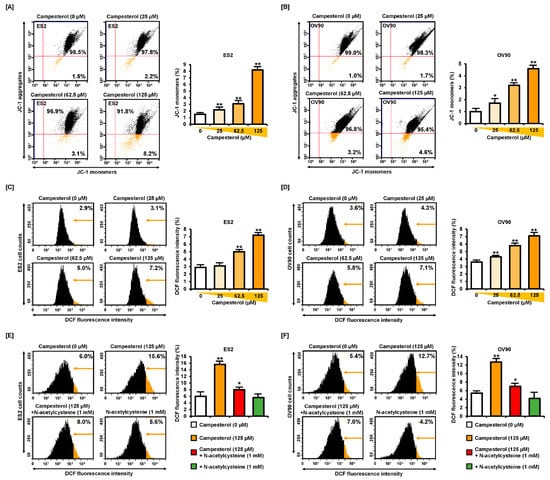All campesterol (0, 25, 62.5, and 125 µM) treatment altered the mitochondrial function in the ES2 and OV90 cells in monolayer culture condition. In the ES2 cells, the loss of MMP, quantified as the proportion of JC-1 monomers, was increased to 2.2%, 3.1%, and 8.2% upon treatment with 25, 62.5, and 125 µM of campesterol, respectively, compared with that in the control (1.5%) (Figure 2A). Similarly, in the OV90 cells, the proportion of JC-1 monomers was increased to 1.7%, 3.2%, and 4.6% upon treatment with 25, 62.5, and 125 µM of campesterol, respectively, compared to that in the control (1.0%) (Figure 2B). ROS was investigated in ovarian cancer cells with treatment of campesterol (0, 25, 62.5, and 125 µM) for 1 h using DCFH-DA, 10 µM staining. In the ES2 cells, the generation of ROS, quantified by dichlorofluorescein (DCF) fluorescence intensity, was increased to 3.1%, 5.0%, and 7.2% upon treatment with 25, 62.5, and 125 µM of campesterol, respectively, compared with that in the control (2.9%) (Figure 2C), whereas in the OV90 cells, it was increased to 4.3%, 5.8%, and 7.1% upon treatment with 25, 62.5, and 125 µM of campesterol, respectively, compared with that in the control (3.6%) (Figure 2D). Flow cytometry analysis was conducted after cotreatment with campesterol and N-acetylcysteine (NAC; 1 mM). Campesterol increased ROS levels in ES2 cells (15.6%) and OV90 cells (12.7%). However, NAC mitigated the increase in ROS levels in ES2 cells (8.0%) and OV90 cells (7.0%) (Figure 2E,F).
