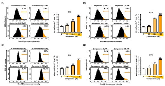 To determine the changes in the levels of calcium, we treated the cells with 0, 25, 62.5, and 125 µM of campesterol in monolayer culture condition. Thereafter, the calcium levels in the cytosol and mitochondria were determined using fluo-4-AM and rhod-2 fluorescence, respectively. In the ES2 cells, the cellular calcium levels, quantified by fluo-4 fluorescence intensity, were increased to 5.4%, 8.4%, and 12.4% upon treatment with 25, 62.5, and 125 µM of campesterol, respectively, compared with that in the control (4.6%) (Figure 3A), whereas they were increased to 4.6%, 10.7%, and 13.3%, respectively, compared with that in the control (4.1%) in the OV90 cells (Figure 3B). The levels of calcium in the mitochondria, quantified by rhod-2 fluorescence intensity, increased to 4.8%, 6.3%, and 10.1% in the ES2 cells (Figure 3C) upon treatment with 25, 62.5, and 125 µM of campesterol, respectively, compared with that in the control (4.2%) and to 3.5%, 5.5%, and 7.8% in the OV90 cells (Figure 3D) upon treatment with 25, 62.5, and 125 µM of campesterol, respectively, compared with that in the control (3.0%).