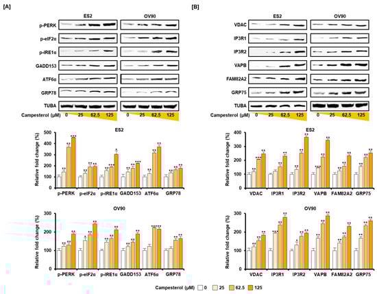 Activation of the ER-stress sensor and the ER–mitochondrial axis signals by campesterol in the ovarian cancer cells. (A) Western blot analysis of ER-stress proteins in the cells treated with campesterol (0, 25, 62.5, and 125 µM). (B) Western blot analysis of the ER–mitochondrial axis proteins in the cells treated with campesterol (0, 25, 62.5, and 125 µM). TUBA was used as a control. The graph represents the relative fold changes in the levels of proteins induced by campesterol treatment compared with that in the control (100%). The data represent three independent experiments. The asterisks indicate significant differences between the treated cells and control cells (*** p < 0.001, ** p < 0.01, and * p < 0.05).
