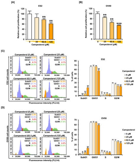 Cell proliferation was observed using a BrdU ELISA Kit. Treatment of campesterol (0, 25, 62.5, and 125 µM) suppressed proliferation in both cell lines. The proliferation of the ES2 cells was inhibited by up to 39.0% at 125 µM of campesterol (EC50 = 245.13 µM) (Figure 5A). The cell proliferation of the OV90 cells was reduced by up to 46.0% at 125 µM of campesterol (EC50 = 147.13 µM) (Figure 5B). In terms of cell cycle progression, ovarian cancer cells were treated with campesterol (0, 25, 62.5, and 125 µM) for 48 h and staining with RNase A and PI. The sub-G1 phase was increased by up to 18.8% at 125 µM of campesterol compared with that in the control (0.6%) in the ES2 cells (Figure 5C). Whereas, in the OV90 cells, it was increased by up to 13.3% at 125 µM of campesterol compared with that in the control cells (0.5%) (Figure 5D).