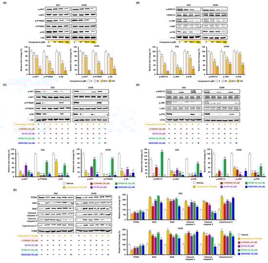 For investigate intracellular signal transduction, ovarian cancer cells were treated with campesterol (0, 25, 62.5, and 125 µM) for 48 h. The cell proliferation-related intracellular signal pathways were identified using western blot analysis. The phosphorylation of AKT, P70S6K, and S6 was decreased by campesterol 0, 25, 62.5, and 125 µM treatment compared to the levels of the respective total protein in both cell lines (Figure 6A). Additionally, the phosphorylation of ERK1/2, JNK, and p38 was inhibited in a dose-dependent manner by campesterol (0, 25, 62.5, and 125 µM) compared to the levels of the respective total protein in both cell lines (Figure 6B). Next, we determined the signal correlation in greater detail using signal cascade inhibitors, including a PI3K inhibitor (LY294002; 20 µM), ERK1/2 inhibitor (U0126; 20 µM), JNK inhibitor (SP600125; 20 µM), and P38 inhibitor (SB203580; 20 µM). The cells were treated with each inhibitor before the campesterol treatment. The phosphorylation of AKT was almost blocked by LY294002 and SB203580 in the ES2 and OV90 cells, respectively. The phosphorylation of P70S6K was inhibited by LY294002 in the ES2 cells and OV90 cells. The phosphorylation of S6 was decreased by LY294002 in the ES2 cells and inhibited by LY294002 and SP600125 in the OV90 cells (Figure 6C). The phosphorylation of ERK1/2 was inhibited by U0126 in both cell lines. The phosphorylation of JNK was completely blocked by LY294002, U0126, and SP600125 in the ES2 cells. p-JNK was repressed by U0126 in the OV90 cells. The phosphorylation of P38 was completely blocked by SB203580 in the ES2 cells and inhibited by LY294002 and SB203580 in the OV90 cells (Figure 6D). In addition, campesterol treatment resulted in a reduction of proliferating cell nuclear antigen (PCNA) levels. In addition, the combination of campesterol and each pharmacological inhibitor suppressed PCNA compared to the vehicle-treated control in both cell lines. Campesterol-induced the expression of several proapoptotic protein, which in some cases was prevented by cotreatment with the anti-apoptotic inhibitors. BAX protein levels were decreased by LY294002, U0126, and SB203580 treatment in ES2 cells, and by all inhibitors in OV90 cells. BAK protein levels were diminished by SB203580 in ES2 cells and by all inhibitors in OV90 cells. Cleaved caspase 3 levels were decreased by LY294002 and SB203580 in ES2 cells and slightly increased by LY294002 and SB203580 in OV90 cells. Cleaved caspase 9 and cytochrome c were decreased by all the inhibitors in both cell lines. For the western blot analysis, the proapoptotic protein levels were compared to those of TUBA (Figure 6E).