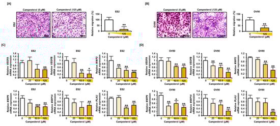 The cells were treated with campesterol (125 µM) and stained with hematoxylin. The migration of the ovarian cancer cells was decreased to 84.7% in the ES2 cells and 69.3% in the OV90 cells upon treatment with campesterol compared with that in the control cells (Figure 7A,B). Moreover, the expression levels of the genes that play key roles in migration and angiogenesis, including vascular endothelial growth factor A (VEGFA), VEGFB, matrix metalloproteinase-2 (MMP2), MMP9, MMP14, and plasminogen activator, urokinase (PLAU) were decreased upon campesterol treatment in both cell lines (Figure 7C,D).