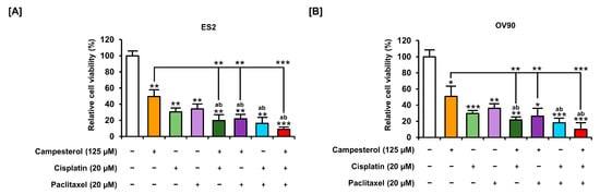 Reduced cell proliferation upon cotreatment with campesterol and existing drugs in ovarian cancer cell lines. (A,B) The proliferation of cells treated with campesterol and existing drugs was determined in relation to that of the control cells (100%). Statistical significance was also shown between the group treated with campesterol alone and the group treated with the conventional drug plus campesterol. The data represent three independent experiments. The asterisks indicate significant differences between the treated cells and control cells (*** p < 0.001, ** p < 0.01, and * p < 0.05). ‘a’ and ‘b’ indicate significant differences as compared to cisplatin and paclitaxel, respectively.