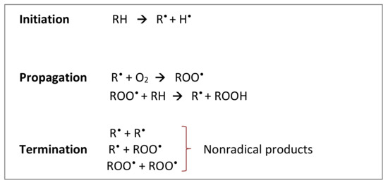The general process of lipid peroxidation [14]. RH: target polyunsaturated fatty acid; R•: fatty acid radical; ROO•: fatty acid peroxyl radical; ROOH: lipid hydroperoxides
