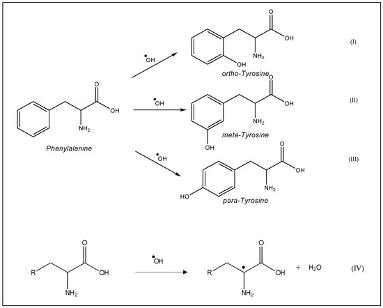 Aromatic amino acids, such as tyrosine, tryptophan, histidine, and phenylalanine, are susceptible to oxygenation of their ring. For example, phenylalanine may generate ortho-tyrosine (Figure 2I) meta-tyrosine (Figure 2II), and 4-hydroxyphenylalanine (para-tyrosine) (Figure 2III) during oxidation. Aliphatic amino acids are oxidized by hydrogen abstraction at the alpha carbon and give a carbon-centered radical (Figure 2IV).
