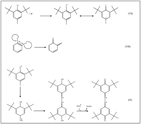 Monophenols create unreactive phenoxyl radicals due to resonance stabilization (Figure 3VII), while diphenols, when oxidized, produce quinones (Figure 3VIII). Some of the monophenols (in a radical state and stabilized by resonance) can be polymerized, for example a natural antioxidant gamma-tocopherol or a synthetic antioxidant butylated hydroxytoluene (BHT), and give a non-radical dimer (Figure 3IX). These reactions disrupt the free radical chain propagation.
