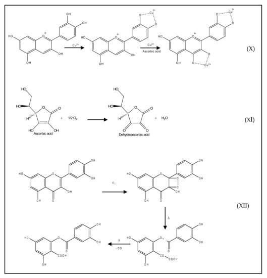 Reaction mechanisms of secondary antioxidants: (X) Metal ion (Cu2+) chelating activity of anthocyanidine (cyanidin), from [30] published by The Royal Society of Chemistry; (XI) oxygen scavenging activity of ascorbic acid, reproduced from [31] under Creative Common license; (XII) chemical reaction of quercetin with singlet oxygen, reproduced from [32] with the permission of Elsevier.