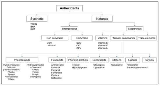 Antioxidants are divided between endogenous and exogenous (Figure 5). One of the most interesting families of natural antioxidants is phenolic compounds. They are frequently found in food, such as anthocyanins and monomeric flavanols in red wine and berries, hydroxycinnamic and hydroxybenzoic acids in fruits and vegetables, ferulic acid in cereals, flavonols in tea, secoiridoids in olive oil, etc., [1,14,33,34,35,36,37,38,39,40,41].