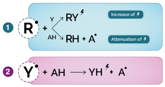 In general, the principle of antioxidants is based on avoiding radical initiation or propagation of radical state through several mechanisms. Antioxidants can be classified as primary or secondary antioxidants according to their mechanism of action. The primary or chain-breaking antioxidants (A:H in the following equations)) are able to give a hydrogen atom (Equation V) and a single electron (Equation VI) to a radical and thereby neutralizing it, such as phenolic compounds with one or more hydroxyl group (-OH). This mechanism is known for “radical scavenging,” although this term is not fully adapted to the reality of the mechanism.