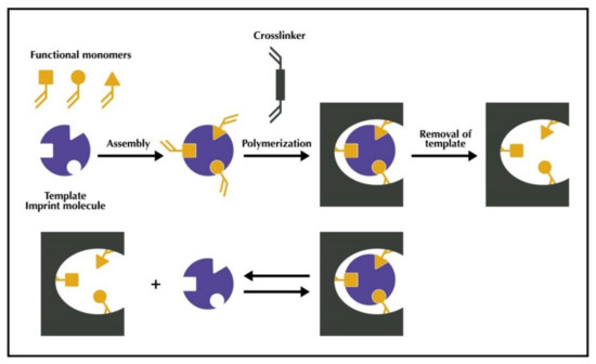 The main phases of the synthesis process are the following: (1) Complexation between functional monomers and template molecules, through different interactions (covalent, semi-covalent, or non-covalent) to form the pre-polymerization complex; (2) polymerization of the pre-polymerization complex with the cross-linkers and initiators under thermal or UV conditions. It involves the bulk, precipitation, suspension, core-shell emulsion, surface imprinting, and multi-step polymerizations, and finally, (3) removal of the template that will reveal a well-defined cavity in the polymer characterized by having a complementary structure to that of the target.