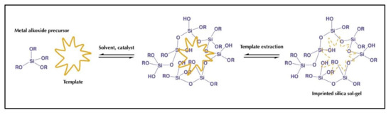 Molecular imprinting technology is a technique that has been attracting the interest of the scientific community for more than 20 years, due to its simplicity, low cost, easy preparation, high selectivity and simplicity, resulting in a great increase in the literature in this field. This technique consists of creating complementary images in terms of structure and chemical functionalities of a target molecule within a synthetic polymer (Figure 8) by creating recognition sites within a polymer with a complementary geometrical and chemical fitting structure, which presents high affinity and selectivity toward the target molecule.