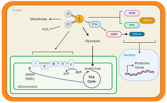 Hydrogen sulfide (H2S) Metabolic Targets in the Heart. Few studies have identified metabolic targets of H2S, but those that have been identified are key for cardiac metabolism. H2S can modify free cysteines on enzymes, a reaction known as S-sulfhydration, to alter metabolic pathways, such as glycolysis, and induce up-regulation of metabolic genes via transcription factor activation. Peroxisome proliferator-activated receptors (PPAR), hypoxia-inducible factor 1α (HIF-1α), and nuclear factor E2-related factor 2 (Nrf2) are transcription factors known to be S-sulfhydrated and regulate heart metabolism. H2S also modified the complexes of the Electron Transport Chain and can stimulate mitochondrial respiration. H2S is considered an antioxidant molecule because it can react with glutathione and hydrogen peroxide (H2O2). Finally, our group found that S-sulfhydration represses protein phosphatase 2A (PP2A) activity, allowing for the activation of adenosine monophosphate kinase (AMPK) and phosphorylation of the transcription factor peroxisome proliferator-activated receptor γ coactivator-1α (PGC-1α) to induce gene expression.