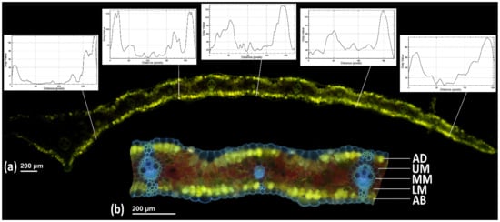 The reaction with Naturstoff reagent A was mainly detected in mesophyll cells and displayed a gradient across internal cell depths. To obtain a relative measure of PhC fluorescence localization, the chlorophyll autofluorescence was digitally removed using a macro in Adobe Photoshop and applied to all photographs as a batch. The macro selected all yellow color and moved it to a new layer in Photoshop, showing only the PhC fluorescence. The PhC fluorescence-only images were opened in ImageJ. The plug-in LinSys Cycloides was used to randomly generate equally spaced vertical lines to provide unbiased systematic random sampling to achieve unbiased estimations of histochemical localization across a gradient in the mesophyll [41] while not intersecting vascular tissues. The distance between these lines was adjusted so that each leaf was vertically intersected in five equally-spaced locations—the first being near the midrib and the fifth being near to the edge of the leaf. The straight-line tool and Plot Profile function provided intensity data for each pixel intersected by the sampling line (Figure 1). The data from the five intersections through the mesophyll tissue along the width of the leaf were further divided by mesophyll depth: adaxial mesophyll layer (AD), upper mesophyll (UM), middle mesophyll (MM), lower mesophyll (LM), and abaxial mesophyll layer (AB). The data from three samples per replication and five locations within leaf width were averaged and used for subsequent statistical analyses.