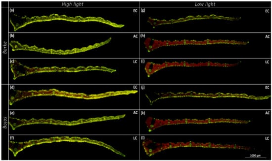 Cross-sections of barley (Hordeum vulgare) leaves for each treatment, showing the clear effect of high light intensity, and elevated [CO2], on leaf phenolic compounds, 40× magnification, treated with Naturstoff reagent A and excited under blue light–half leaf lamina shown from midrib (left) to leaf margin (right). Left column of images shows high light (HL) treatment, right column shows low light (LL) treatment. [CO2] is denoted in frame on right as elevated (EC), ambient (AC), or low (LC). Barke (a) EC-LL; (b) AC-LL; (c) LC-LL; (g) EC-HL; (h) AC-HL; (i) LC-HL. Bojos (d) EC-LL; (e) AC-LL; (f) LC-LL; (j) EC-HL; (k) AC-HL; (l) LC-HL.