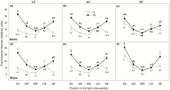 As the results of ANOVA show, location within the leaf, together with light intensity, was the most significant factor determining the accumulation of PhCs (p < 0.001, Table 1). HL leaves accumulated visibly more PhCs than their LL counterparts (Figure 4). One general pattern was observed for leaves cultivated in either HL or EC conditions: fluorescence intensity from the accumulation of PhCs was generally high in AD mesophyll layer of the leaves, slightly lower in AB mesophyll layer, and a decreasing intensity was observed through both UM and LM with the lowest values found in MM (Figure 5). On the contrary, leaves cultivated in LL and either LC or AC conditions had the highest accumulation of PhCs in the LM rather than the AD mesophyll (although leaves cultivated in LL, but EC followed the same pattern as the HL leaves; Figure 4 and Figure 5).