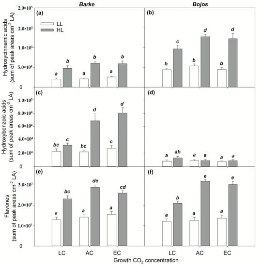 The effect of [CO2] on accumulation of all three groups of PhCs, (Table 2; Figure 6) was statistically significant (p < 0.05) only under HL conditions. The major differences were found between LC/AC and EC, however, the responses to [CO2] were variety specific. While higher effect of [CO2] on hydroxycinnamic acids and flavones was found in variety Bojos, variety Barke showed an increase of hydroxybenzoic acids in response to [CO2] (Figure 6). In general, the differences between AC and EC in accumulation of all three groups of PhCs were small and statistically insignificant. The interactive effects of light intensity and [CO2] show that both LL and LC plants accumulated less PhCs, irrespective of barley variety (Figure 6).