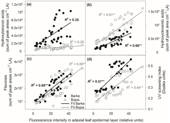 Linear relationships between accumulation of different groups of PhCs in adaxial leaf epidermal layer measured as fluorescence intensity under blue light excitation and total amount of (a) hydroxybenzoic acids, (b) hydroxycinnamic acids, (c) flavones, and (d) UV screening index. Amounts of hydroxybenzoic acids, hydroxycinnamic acids, and flavones are expressed per unit leaf area (LA). Relationships are separated by barley (Hordeum vulgare) variety: Barke–black points and black lines, Bojos–empty points and grey lines. The index of determination (R2) and significance of Pearson’s correlation coefficient (** significant at p = 0.01).