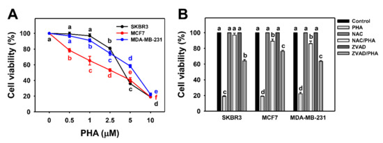 Breast cancer cells are reported to have several subtypes that respond differently to chemotherapy [8]. In the current study, the IC50 concentrations for PHA at 24 h in the ATP study for the three breast cancer cell lines ranged from 3.12 to 6.15 μM (Figure 1A), suggesting that PHA has cell-killing effects against different kinds of breast cancer cells, including those classified [3] as luminal A positive, HER2 positive, and Claudin-low (TNBC). The examination of possible killing effects on other types of breast cancer cells such as luminal B and basal are warranted in the future. Moreover, PHA may have the potential for combinatorial treatment with radiation and immunologically active compounds in a targeted therapy due to the immunoprofile characteristics of MCF7 (ER+, PR+/−, HER2−) and SKBR3 (ER−, PR−, HER2+) cells.