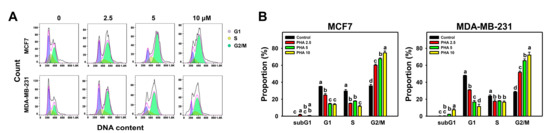 PHA redistributed the cell-cycle phases of two breast cancer cell lines. (A,B) Cell-cycle phase patterns and statistical analysis for concentration responses to PHA. Cells were incubated with PHA (0 (0.05% DMSO as control), 2.5, 5, and 10 μM) for 24 h, i.e., control, PHA 2.5, PHA 5, and PHA 10. Data, means ± SDs (n = 3 independent experiments). Experiments without the same top-labeled letters indicate significant changes according to multiple ANOVA comparisons (p < 0.05 to 0.0001).