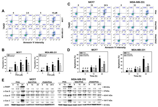 PHA triggers apoptosis and activates caspases in breast cancer cells. (A,B) Annexin V/7AAD patterns and statistical analysis for concentration responses to PHA. Cells were treated with PHA (0 (0.05% DMSO as control), 2.5, 5, and 10 μM) for 24 h. 7AAD (+/−)/annexin V (+) (%) ratio is regarded as the apoptosis (%), and 7AAD (+)/annexin V (−) (%) ratio is regarded as the necrosis (%) [28,29]. (C,D) Pattern and statistical analysis for NAC or ZVAD pretreatment responses in annexin V changes in PHA-post-treated breast cancer cells. Following pretreatment with either NAC (10 mM for 1 h) or ZVAD (100 μM for 2 h), cells were post-treated with 0 (0.05% DMSO as control) and 10 μM PHA for 0, 12, and 24 h, i.e., NAC/PHA or ZVAD/PHA. Data, means ± SDs (n = 3 independent experiments). Experiments without the same top-labeled letters indicate significant changes based on multiple comparisons (p < 0.05 to 0.0001). (E) Apoptosis-signaling expression of PHA-treated breast cancer cells. Cleaved PARP (c-PARP) and cleaved caspase 3, 8, and 9 (c-Cas 3, 8, and 9) expression is compared with reference to β-actin expression.