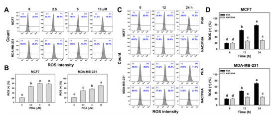 PHA triggered ROS generation in two breast cancer cell lines. (A,B) ROS patterns and statistical analysis for concentration responses to PHA. Cells were incubated with PHA (0 (0.05% DMSO as control), 2.5, 5, and 10 μM) for 24 h. (+) indicates ROS (+) (%). (C,D) Pattern and statistical analysis for NAC pretreatment responses in ROS intensity changes in PHA-post-treated breast cancer cells. Following pretreatment with NAC, cells were processed with post-treatment with 0 (control with 0.05% DMSO) and 10 μM PHA for 0, 12, and 24 h, i.e., PHA and NAC/PHA. Data, means ± SDs (n = 3 independent experiments). Experiments without the same top-labeled letters indicate significant changes according to multiple ANOVA comparison (p < 0.05 to 0.0001).