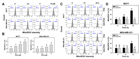 The changes in the MitoSOX generation patterns with different concentrations and exposure times of PHA-treated breast cancer cells were detected by flow cytometry (Figure 5A,C). Following PHA treatment, the breast cancer cells exhibited concentration- and time-course-dependent overexpression for MitoSOX (+) (%) (Figure 5B,D).