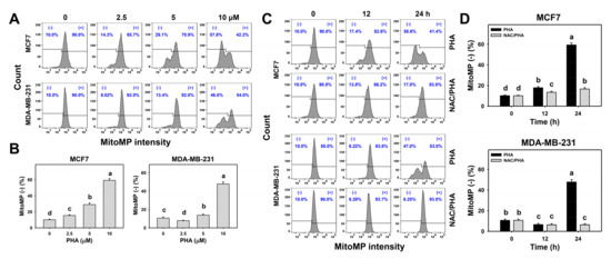 The changes in the MitoMP patterns due to different concentrations and exposure times of PHA-treated breast cancer cells were detected by flow cytometry (Figure 6A,C). PHA induced concentration- and time-course-dependent increases for MitoMP (−) (%) in the breast cancer cells (Figure 6B,D).