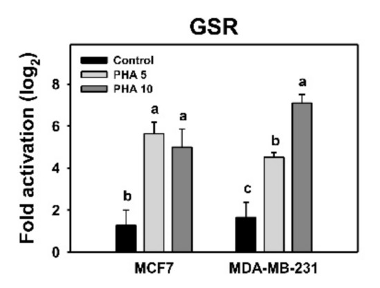 3.7. PHA Induced Antioxidant Signaling—GSR mRNA Expression—In Breast Cancer Cells