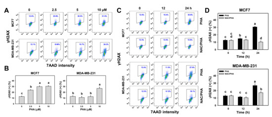The changes in the γH2AX expression patterns with different concentrations and exposure times of PHA-treated breast cancer cells were detected by flow cytometry (Figure 8A,C). PHA induced concentration- and time-course-dependent increases for γH2AX (+) (%) in the breast cancer cells (Figure 8B,D).