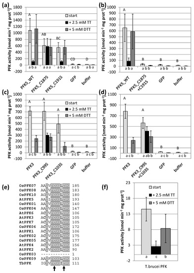 Impact of the CGG(L/I)C motif on PFK activity and oxidation sensitivity. Cys to serine single and double mutations were introduced in the CGG(L/I)C motif of A. thaliana AtPFK3 and AtPFK5 proteins. The variants were transiently overexpressed in tobacco leaves (a–d). Wildtype PFK from T. brucei (f) as well as PFKs from the tobacco leaf samples (a–d) were extracted with buffer containing 5 mM β-mercaptoethanol (β-ME). After initial activity determination, samples were oxidized with 2.5 mM sodium tetrathionate (TT) for 20 min, and afterwards re-reduced with 5 mM dithiothreitol (DTT). Upper case letters indicate significant differences for each isoform to buffer and GFP control, lower case letters indicate significant differences among treatments for each isoform at p < 0.05 (ANOVA, Post hoc Tukey test, n = 3–6). The results are means ± SD. (e) Detail of the protein alignment of the CGG(L/I)C motif in PFKs from A. thaliana, O. sativa and T. brucei. The two mutated Cys are marked with an arrow.